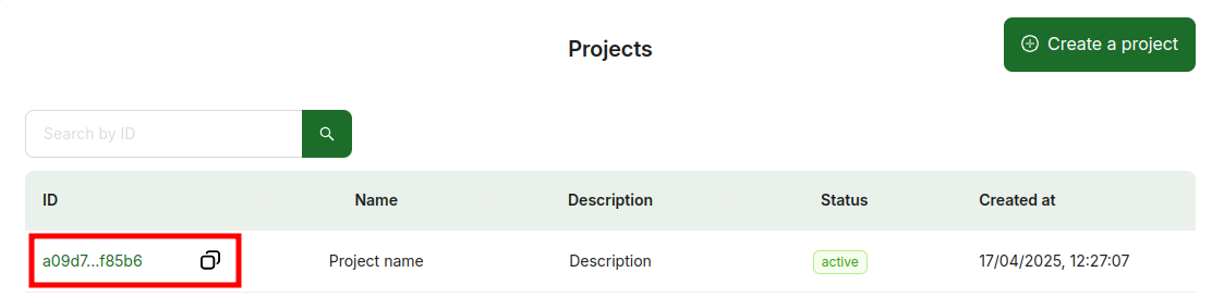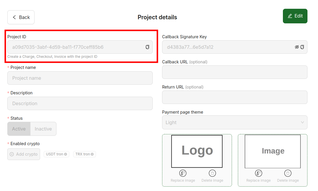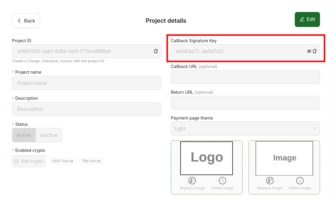 For each new project, Cryptix generates project ID and callback signature key. Project ID is used for creating such system objects as charges, invoices, checkouts and others. The callback signature key is used to sign webhooks. For more information about signatures and signing process, see Signature Verification.